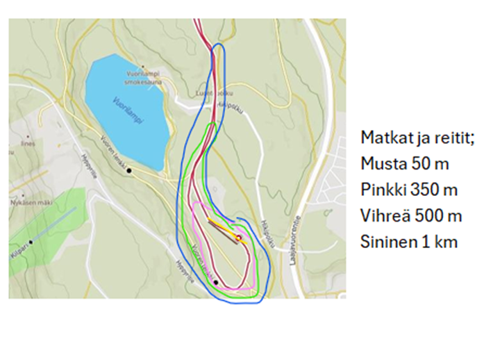 50M ja 350M reiteillä huoltaja saa kulkea lapsen vierellä, kunhan ei riko perinteisen latu-uraa.